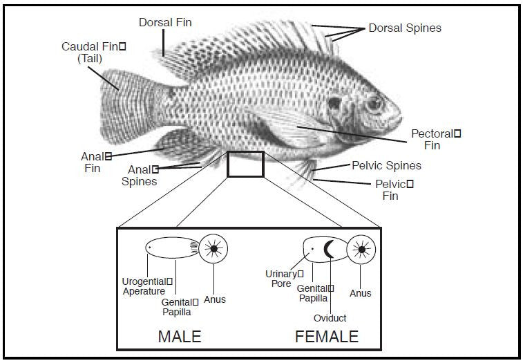 When a Tilapia fingerling has reached a weight of one ounce, it can normally be sexed by looking at the genital paella. The genital papilla is located just behind the anus of the fish.